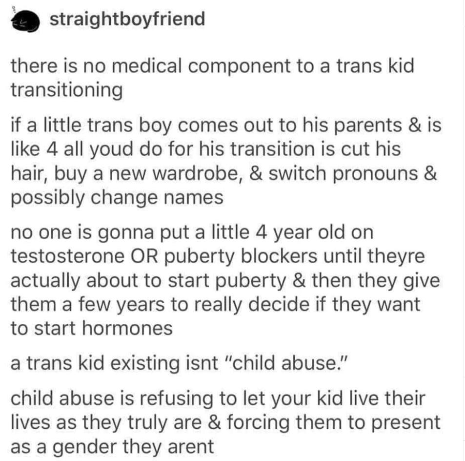 Please note that zero medical interventions happen during this time. Let me repeat that: NO medical interventions (ex: puberty blockers, hormone therapy, surgery) happen during childhood. None.