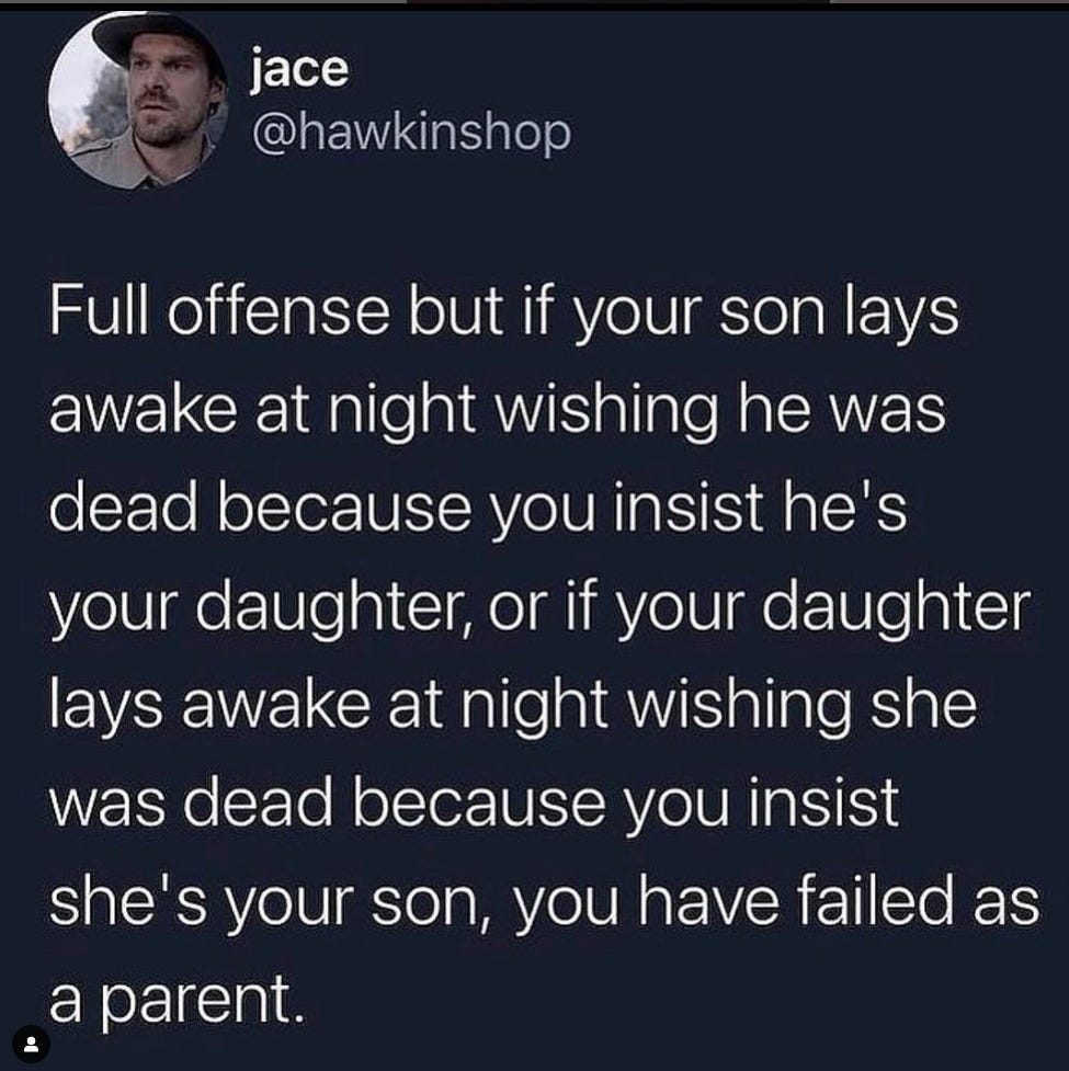 If they reach a point where they are desperate enough to risk bullying & harassment from their peers and being outed to their parents in order to gain some peace of mind by at least being called by a name and pronouns that fit them, research has shown that it’s imperative for the well-being of that child/adolescent for others to honour their request (more info on that in the next section).